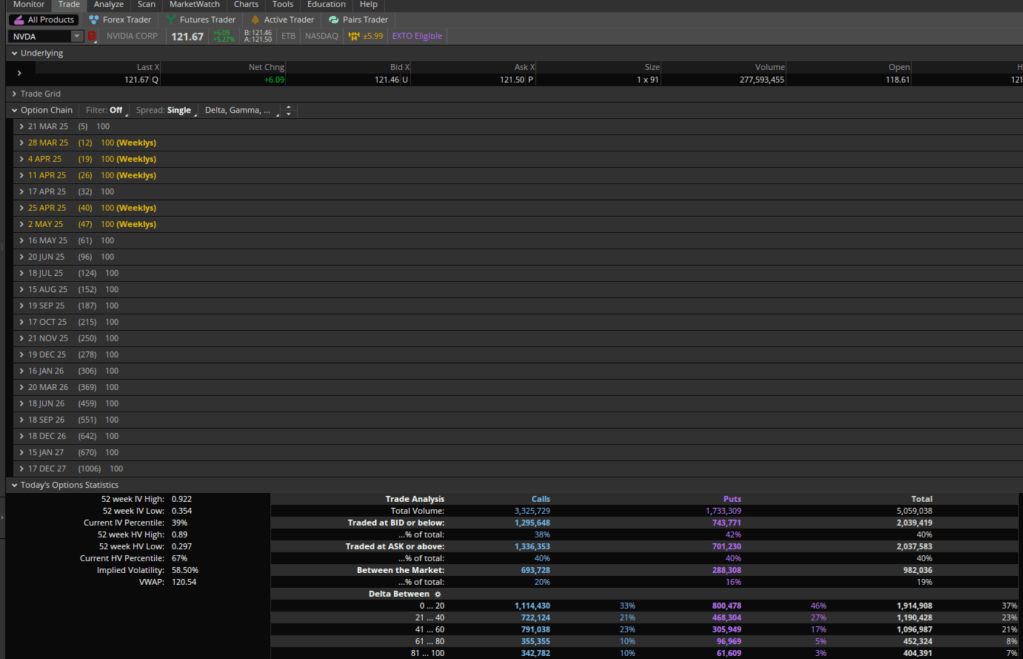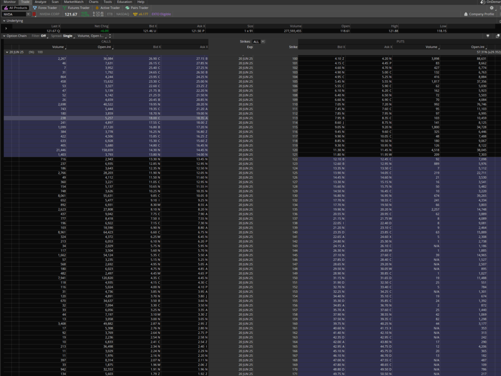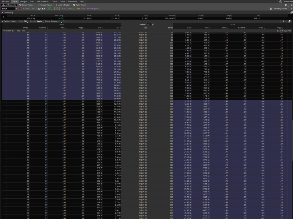 The in-the-money options are highlighted in blue. Generally, if you have a strong conviction on a position (in this case, long NVDA 6/20/25 calls), you should buy the out-the-money options to maximize your leverage and risk-adjusted returns.