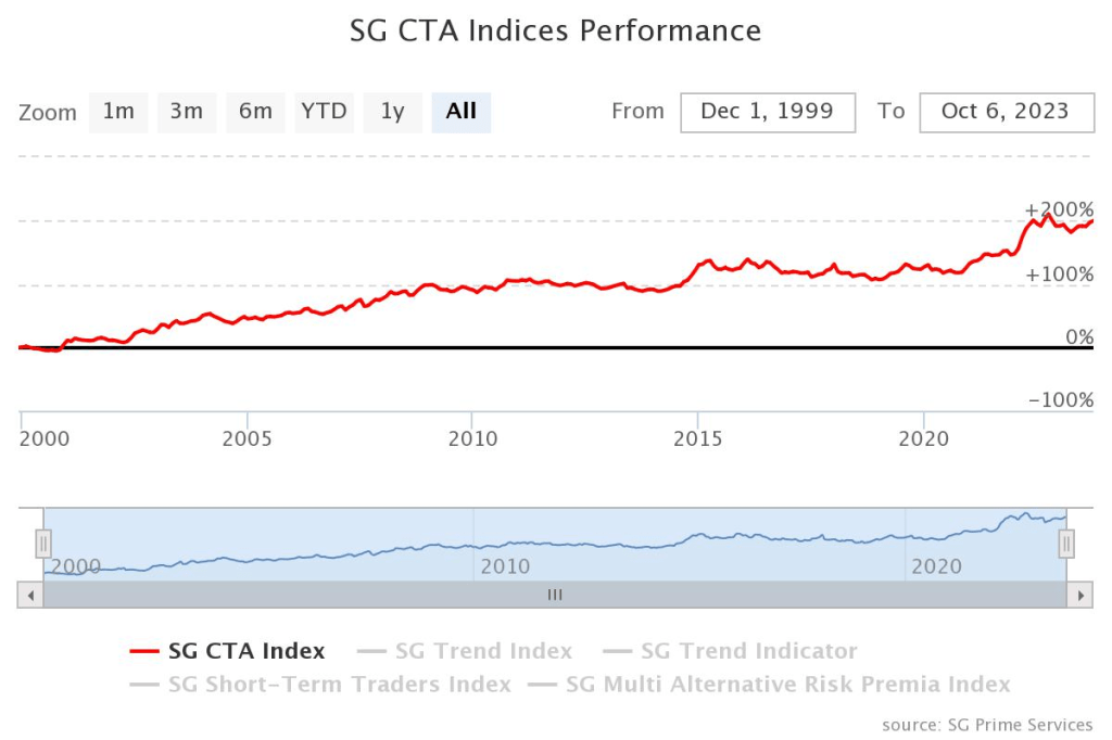 This chart shows the performance of one illustrative diversified CTA fund managed by Société Générale – the SG CTA Index.