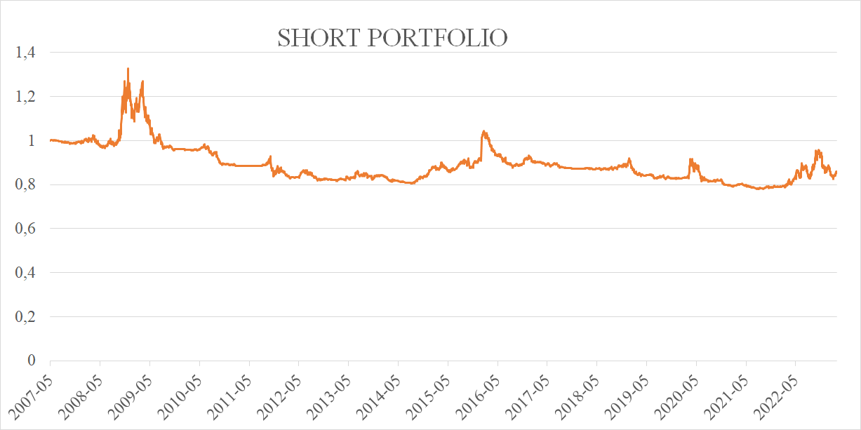 The Commodities sub-strategy follows in risk (12.12%) but yields positive cumulative annual returns of 0.54%. The Short Bonds + FX sub-strategy appears as the least risky, with lower volatility (4.22%) and a milder drawdown (-13.57%). The Short Bonds Portfolio stands out in terms of performance – with its annual return of 0.75%, being the best in performance among the three short portfolios.