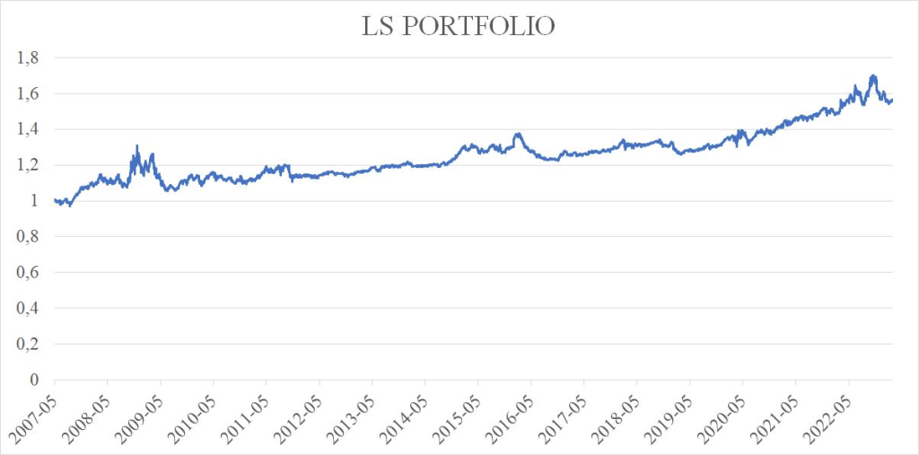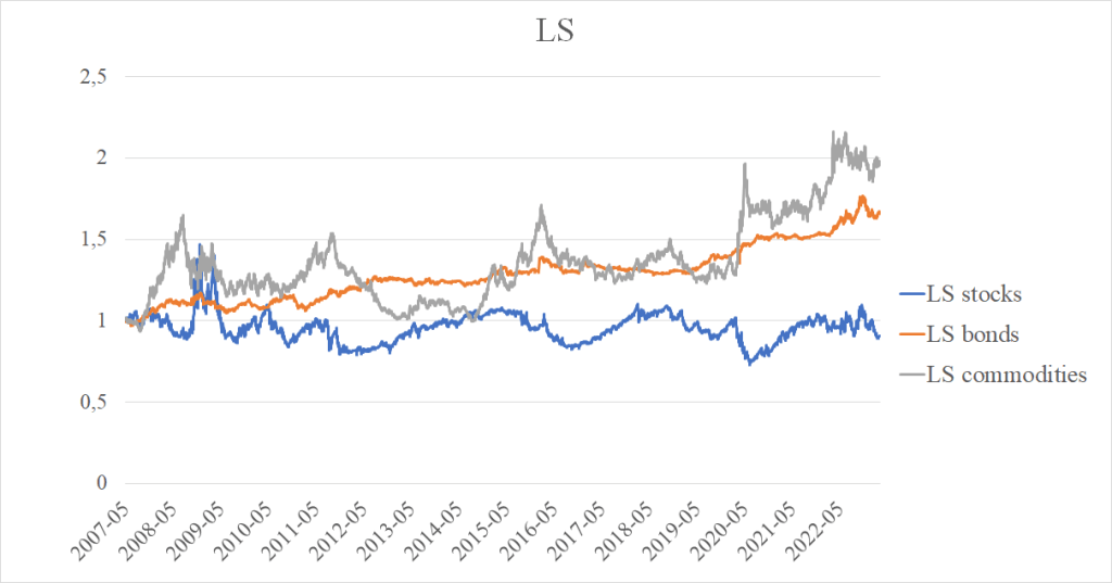 The strategy involving both long and short positions across various asset types does not yield significant performance. It may have the “crisis hedge” characteristics, but the price for that is high.