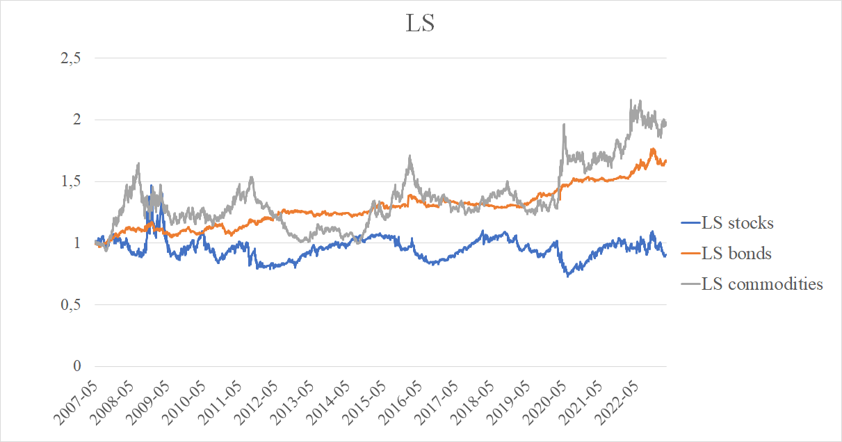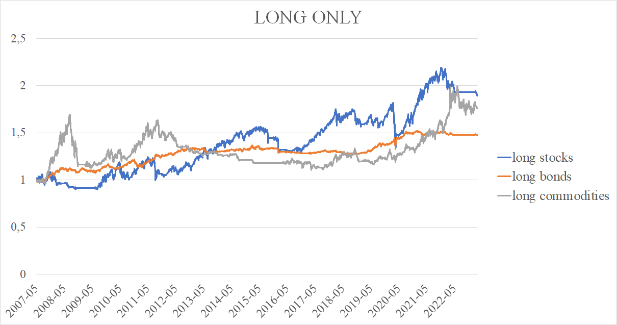 To achieve this, we first break down the diversified strategy into groups and then into various sub-strategies by taking different positions in each type of asset — taking long-only positions separately for stocks, bonds + FX, and commodities, long-short positions for stocks, bonds + FX, and commodities, and short-only position for stocks, bonds + FX, and commodities. Then, we examine the performance of all sub-strategies and draw conclusions.