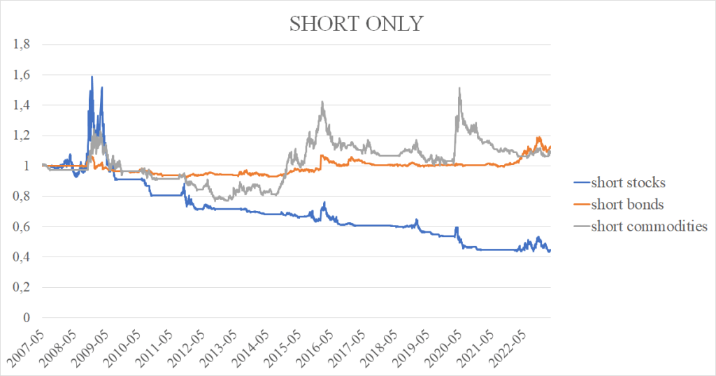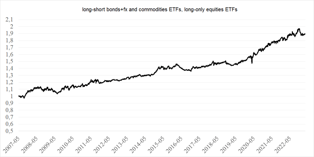 Although a short position, from time to time, in stocks is useful as a crisis hedge, it is done at costs that are too high, especially when we compare this short-only sub-strategy in equity ETFs sub-universe to the short-only (or long-short) sub-strategies, that use the commodities-only ETFs or bonds + FX ETFs, which are sufficient crisis hedges at minimum costs.