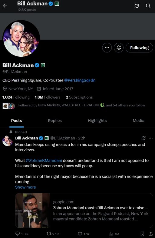 Here, Bill is discussing about the NYC mayoral race in 2025, and has been promoting the same anti-Mamdani message for about a month. In fact, his hedge fund friend named Daniel Loeb has also been promoting the same anti-Mamdani message for about a month. Coincidence? They’re both billionaires?