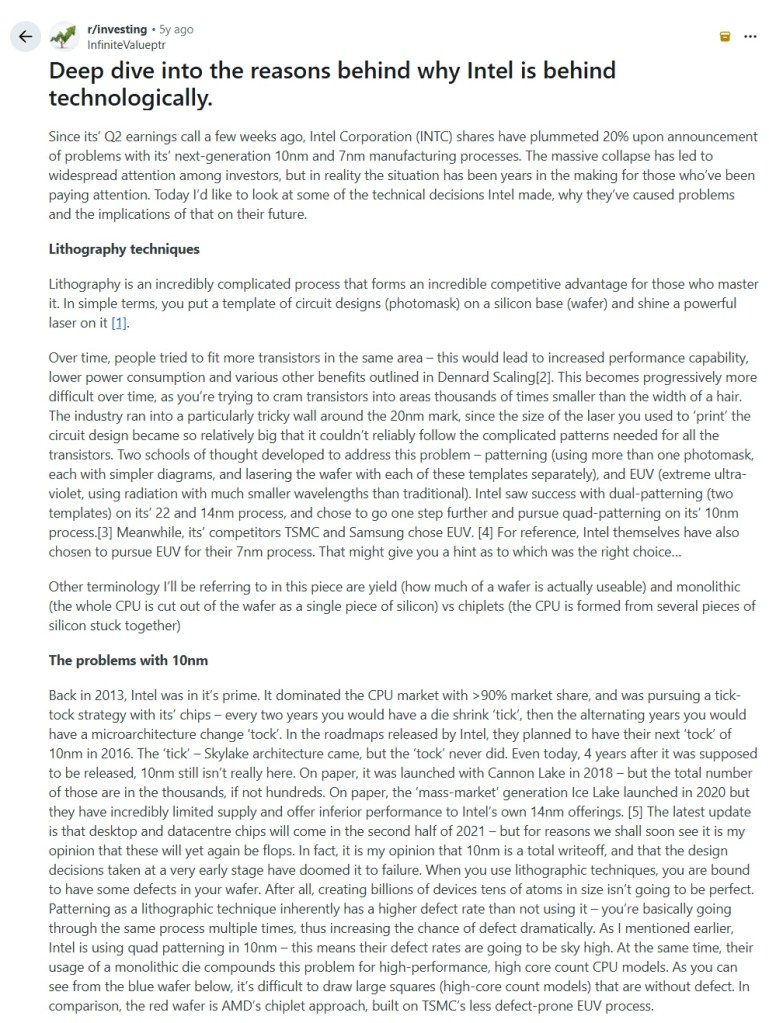 Now, let’s move onto Reddit. Here is an example post by a user in the subred r/investing that does a technical / engineering-level deep dive into the lithography process at Intel and why it’s behind competitors (a short thesis).