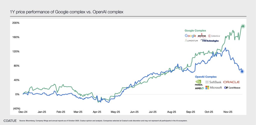 A recent X post by Philippe Laffont of Coatue highlighted the the price performance difference between the “Google Complex” of stocks significantly diverging from that of the “OpenAi Complex” of stocks. My initial thoughts on this divergence.