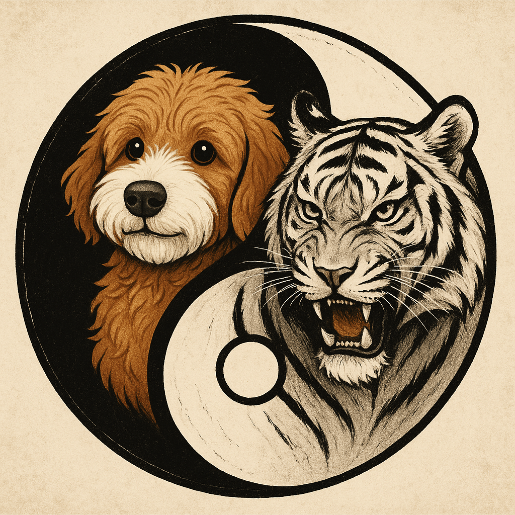 Allow me to make a long digression into Taoism and the idea of yin and yang, as I believe this gets to the heart of developing a sustainable and lasting solution. In Chinese creation theory, the universe develops out of a primary chaos of primordial Qi, organized into the cycles of yin and yang, force and motion leading to form and matter. Yin (the goldendoodle) is the feminine energy of Qi, while yang (the tiger) is the masculine one.